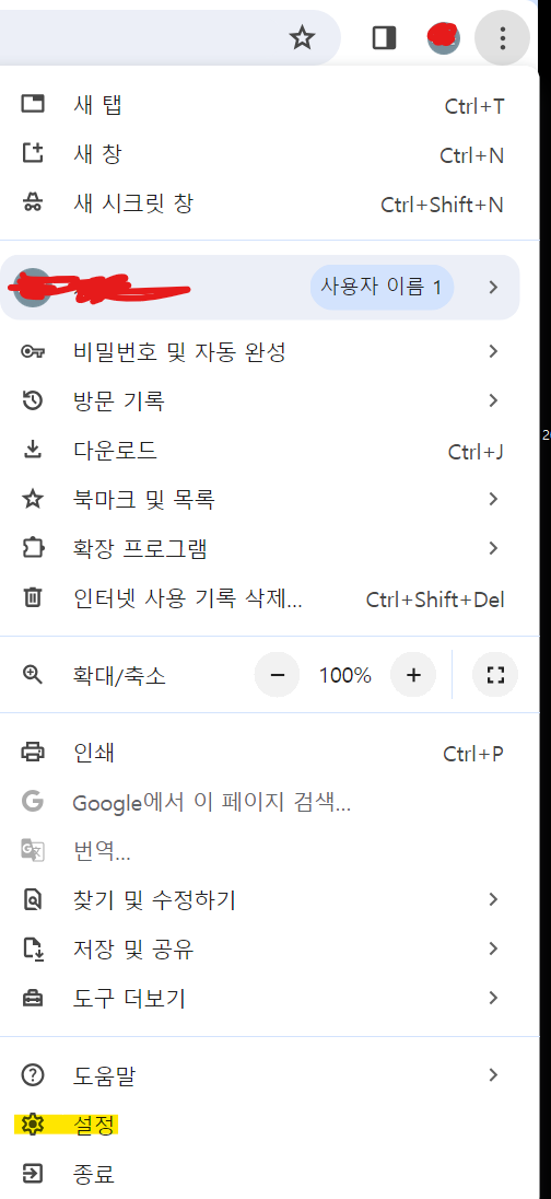 1. 크롬창으로 들어가서 점세개 표시를 누르고 설정에 들어가준다.